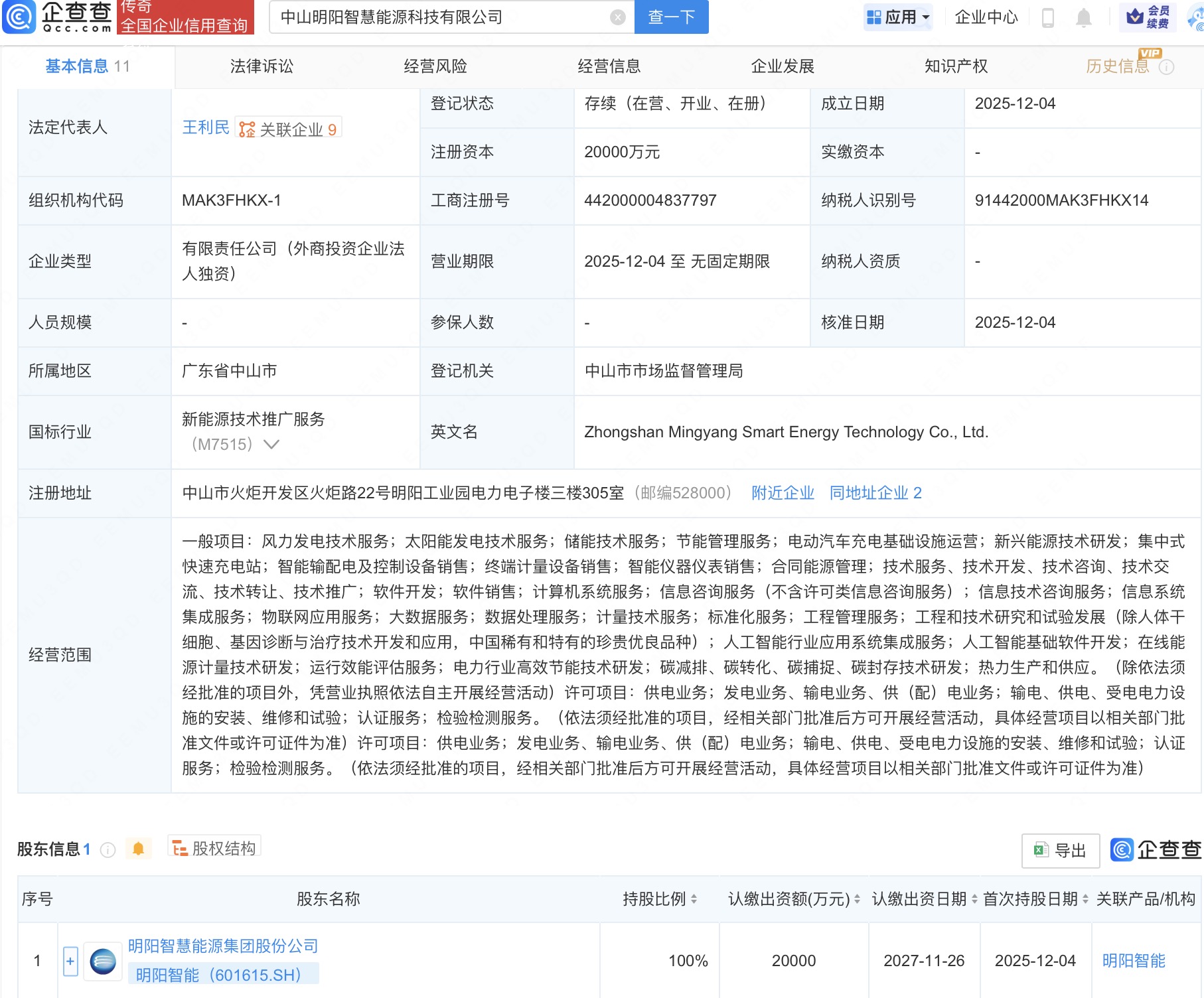 企查查APP显示,近日,中山明阳智慧能源科技有限公司成立,法定代表人为王利民,注册资本2亿元,经营范围包括风力发电技术服务、太阳能发电技术服务、储能技术服务、节能管理服务、电动汽车充电基础设施运营等。企查查股权穿透显示,该公司由明阳智能(601615)全资持股。